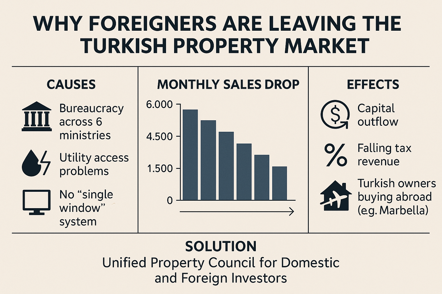 Турция теряет инвестиционную привлекательность в недвижимости из-за перегруженной бюрократии, непрозрачных процедур и отсутствия реальных стимулов для долгосрочных вложений. Необходима быстрая реформа и новая модель управления отраслью — иначе тренд “Анталия на Марбелью” станет массовым.